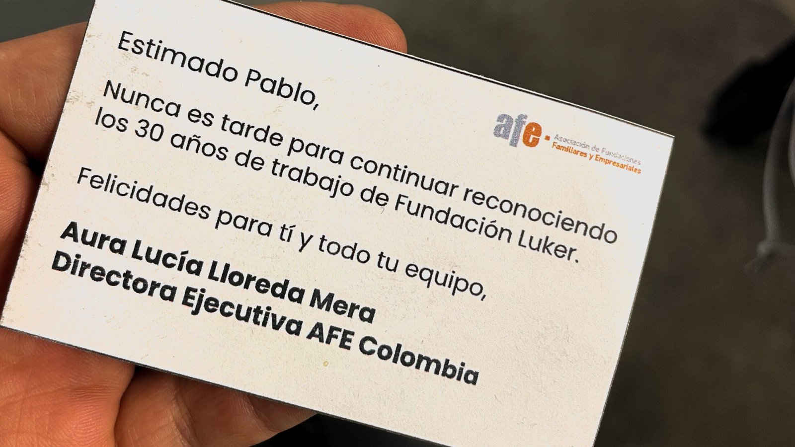 Con profunda gratitud recibimos un reconocimiento de la Asociación de Fundaciones Empresariales (AFE), en cabeza de Ana Lucía Lloreda Mera, directora ejecutiva. Llega en un momento muy especial para nuestra fundación. Este año celebramos con orgullo nuestros 30 años de servicio, una trayectoria que ha estado marcada por el compromiso, la dedicación y el esfuerzo de todos lo que hacemos parte de este equipo.